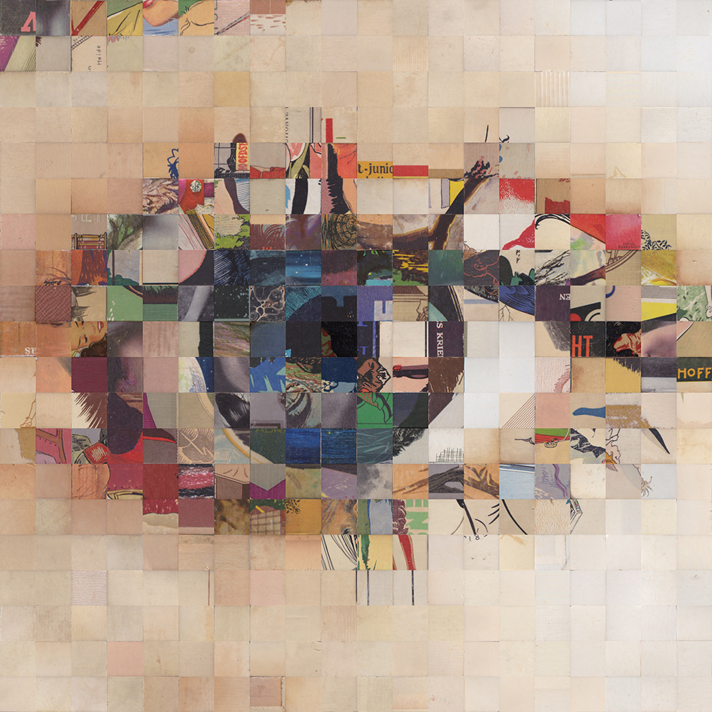 Every piece is manually composed of carefully crafted small tiles, each cut from a range of materials such as painted archival board or vintage art prints.