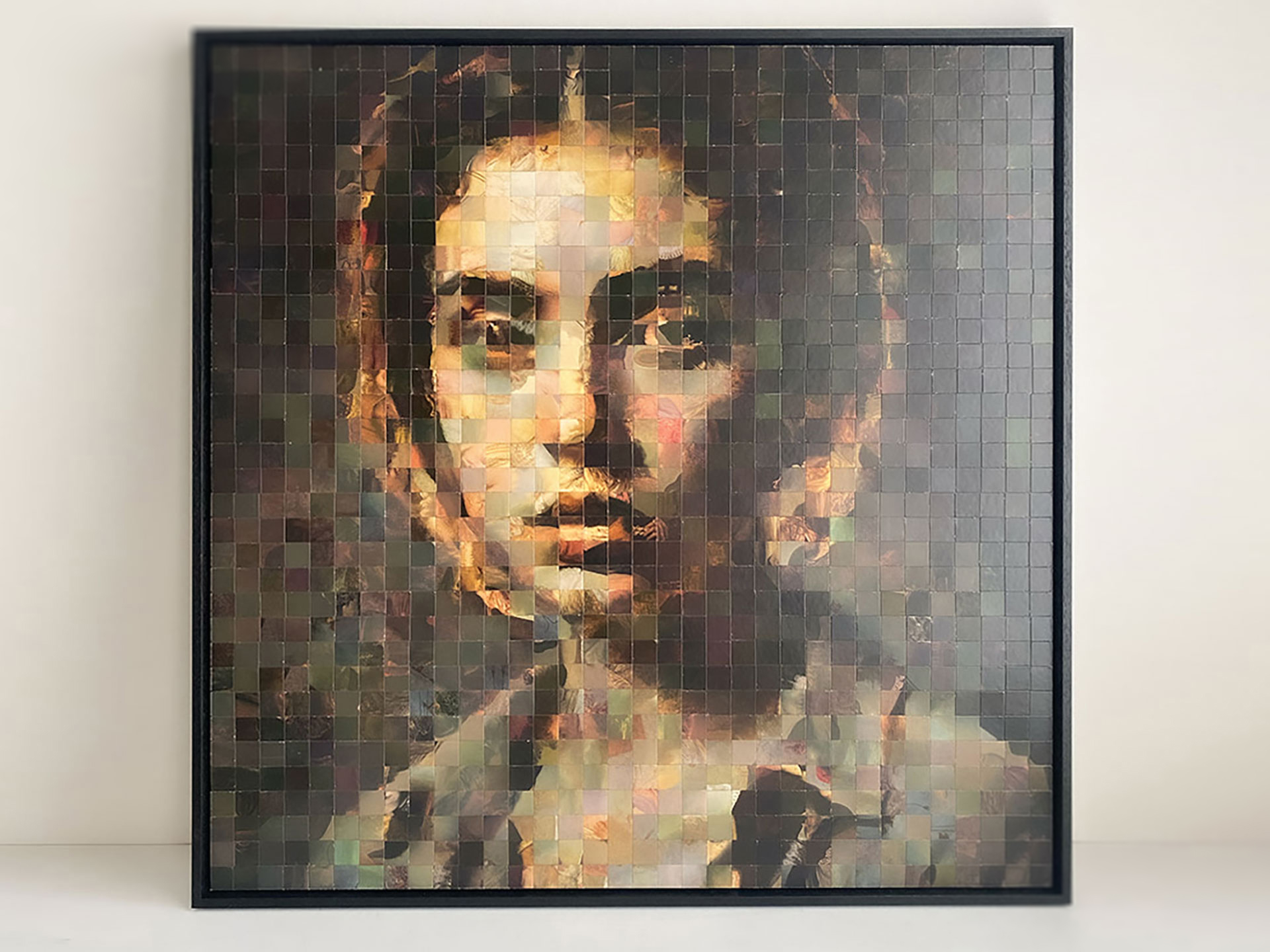 From a distance, the work reads as a unified image. Up close, the individual fragments reveal colour, texture, and accumulated visual memory.
