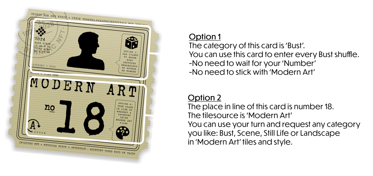 Instead of claiming the physical piece, holders may choose to have it sold through Tessera Shop. The Claim Card will then be mutated into ‘Shop Stock’ and the physical piece will be listed for retail price (in fiat) to the broader web2 audience.