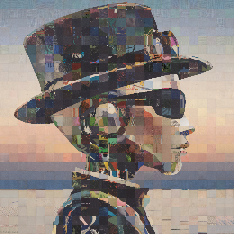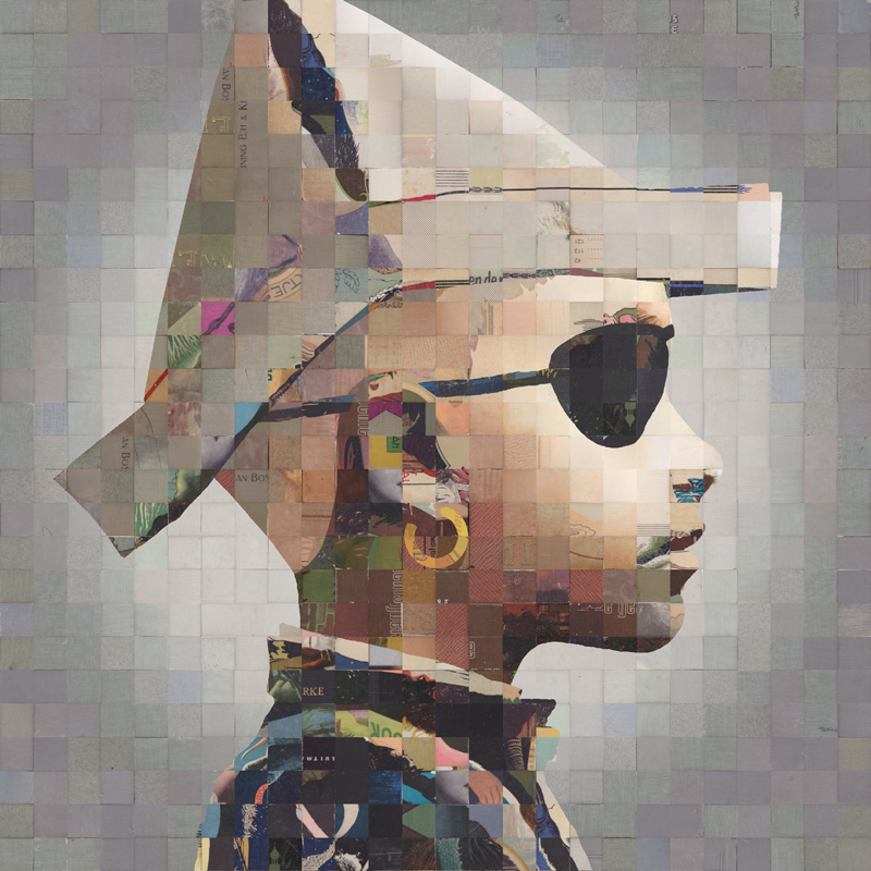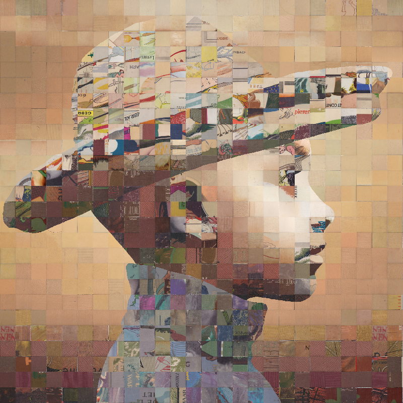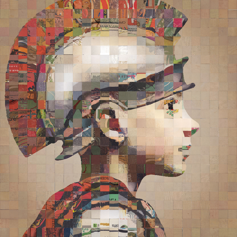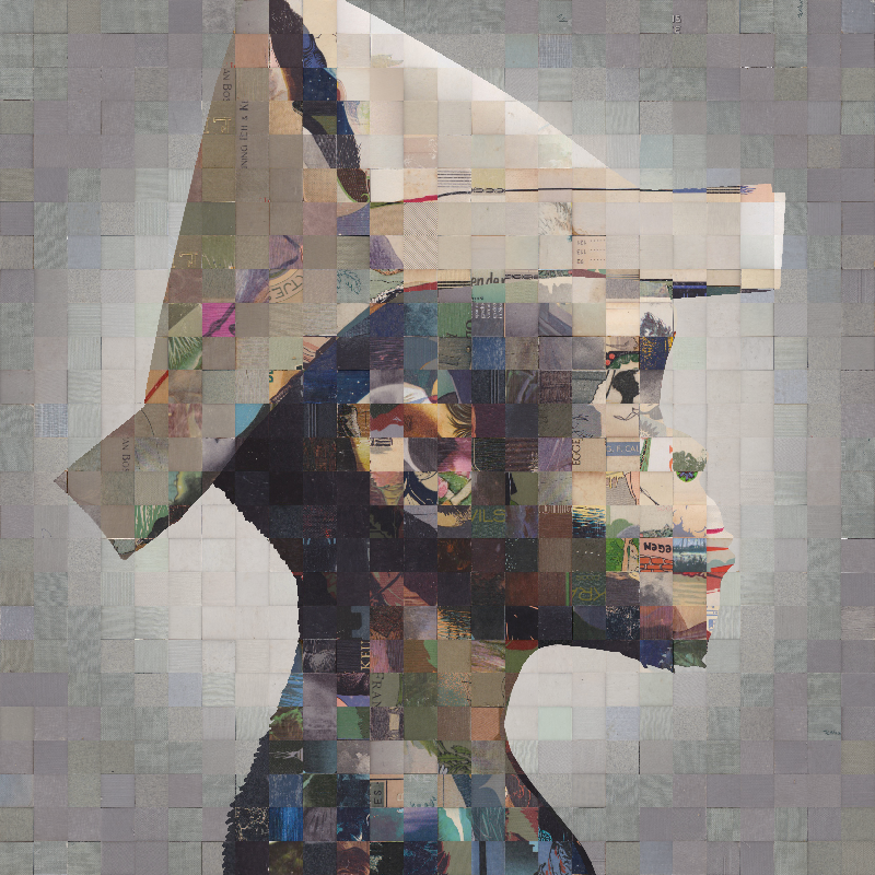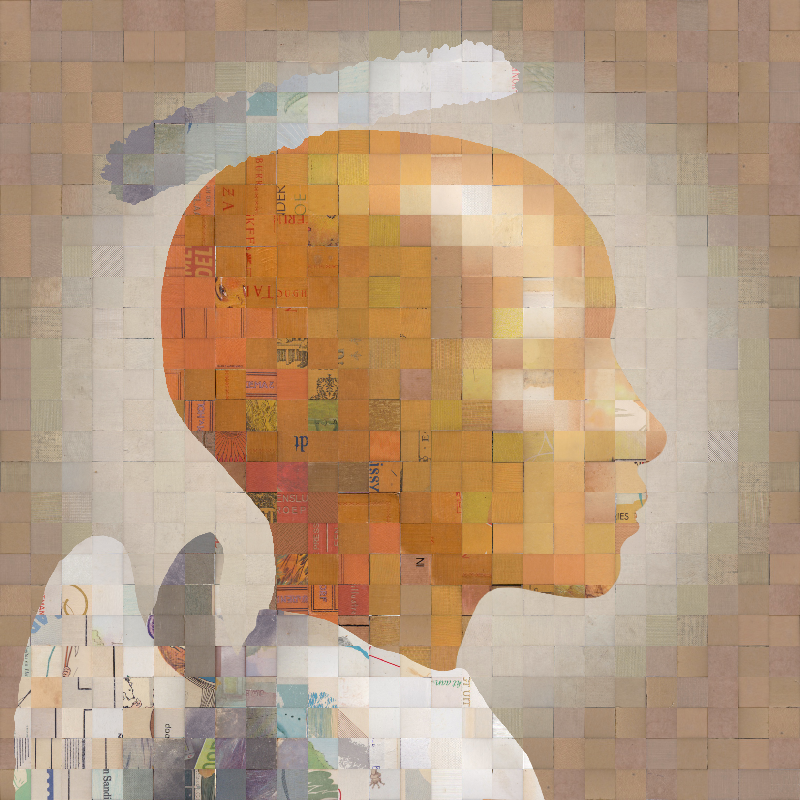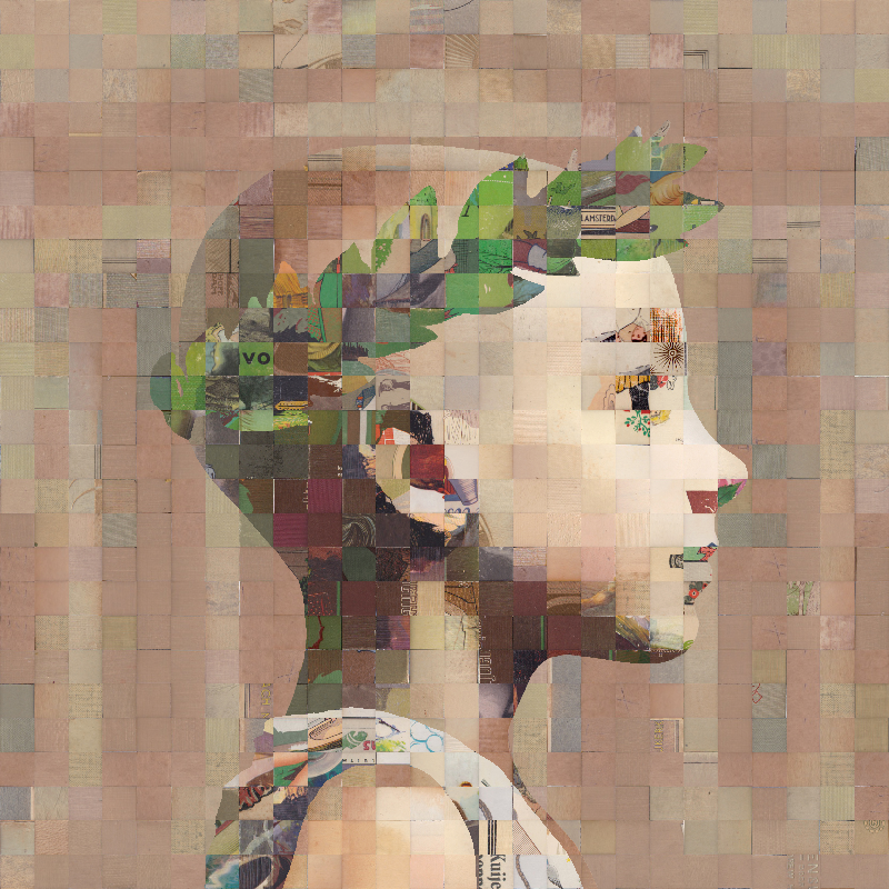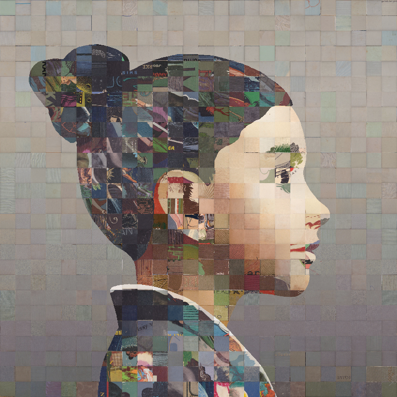 My IRL mosaics are handmade one-offs, both commissioned and free work, and are most often put up for sale in galleries and at art fairs. For each handcrafted mosaic I need ±2000 small tiles from real children’s book covers to choose from. These small tiles are handcut and physically filed and subsequently digitally catalogued. Over the course of the last decade I have garnered up to 75.000 small digital files of unique colorful ‘pixels’ of real world pieces of book cover that are inextricably linked to handmade works of art.